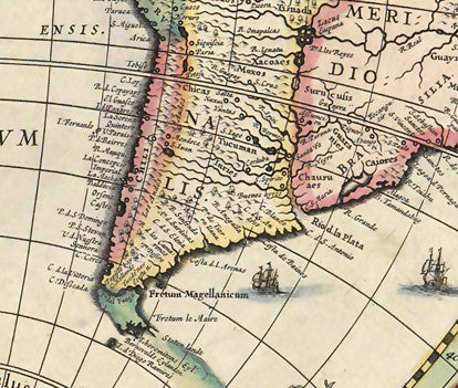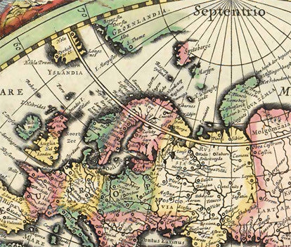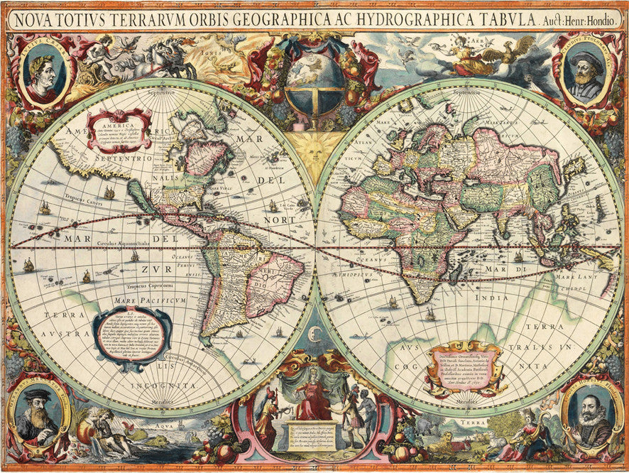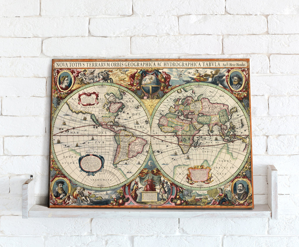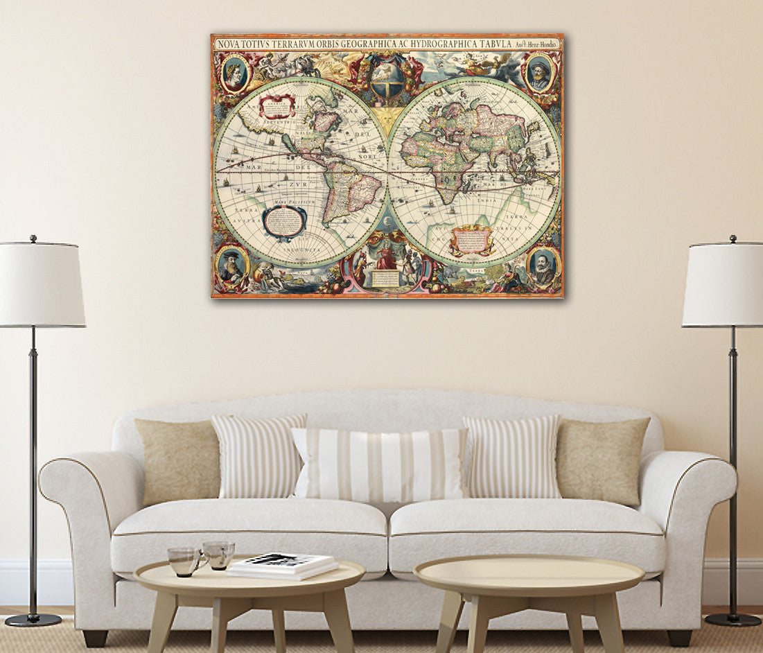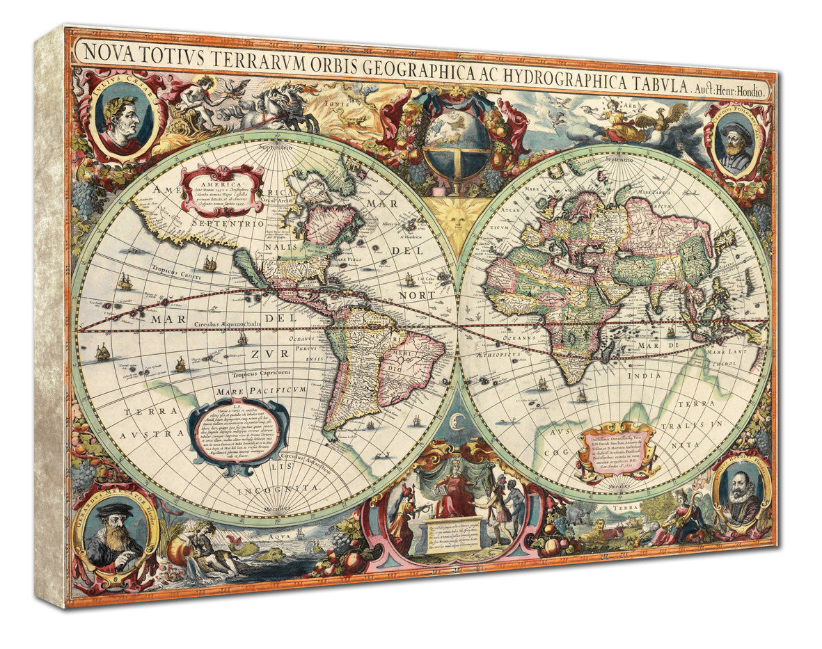 A canvas print of a wonderfully decorative antique world map by Henricus Hondius, first issued in the 1630 edition of the Mercator-Hondius Atlas. The basic cartography follows John Speed's world map. Portraits of Ptolemy, Mercator, Hondius and Julius Caesar are included in the beautifully detailed and decorative borders. One of the most beautiful world maps of the period.