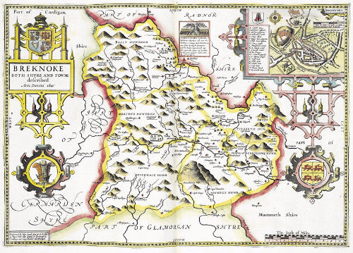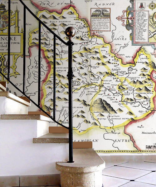 A Beautiful Vintage County map of Breconshire. A reproduction of the hand drawn map by the 17th Century cartographer John Speed. Set within a decorative border and surrounded by intricate illustrations including a plan of Brecon. This highly decorative antique wallpaper will transform any wall into an interior masterpiece.