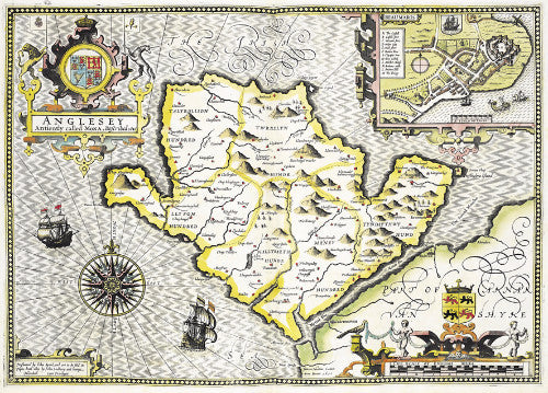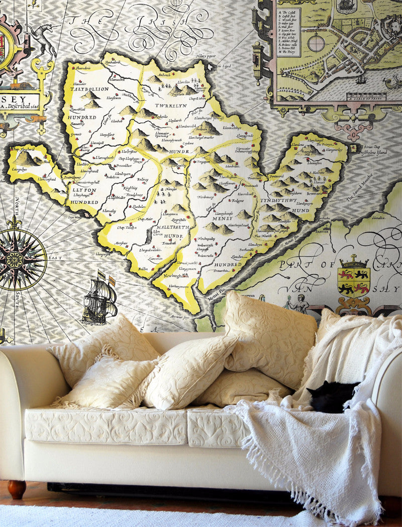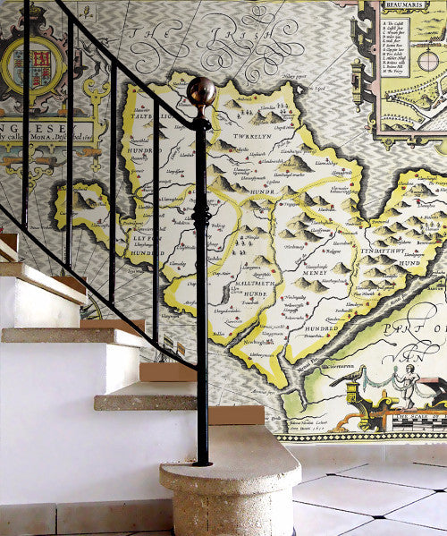 A Beautiful Vintage County map of the Isle of Anglesey. A reproduction of the hand drawn map by the 17th Century cartographer John Speed. Set within a decorative border and surrounded by intricate illustrations including a plan of Beaumaris. This highly decorative antique wallpaper will transform any wall into an interior masterpiece.