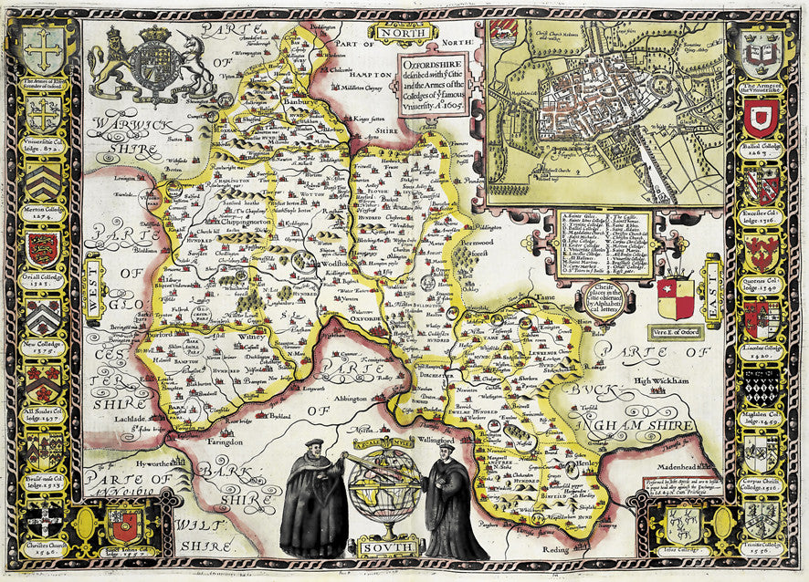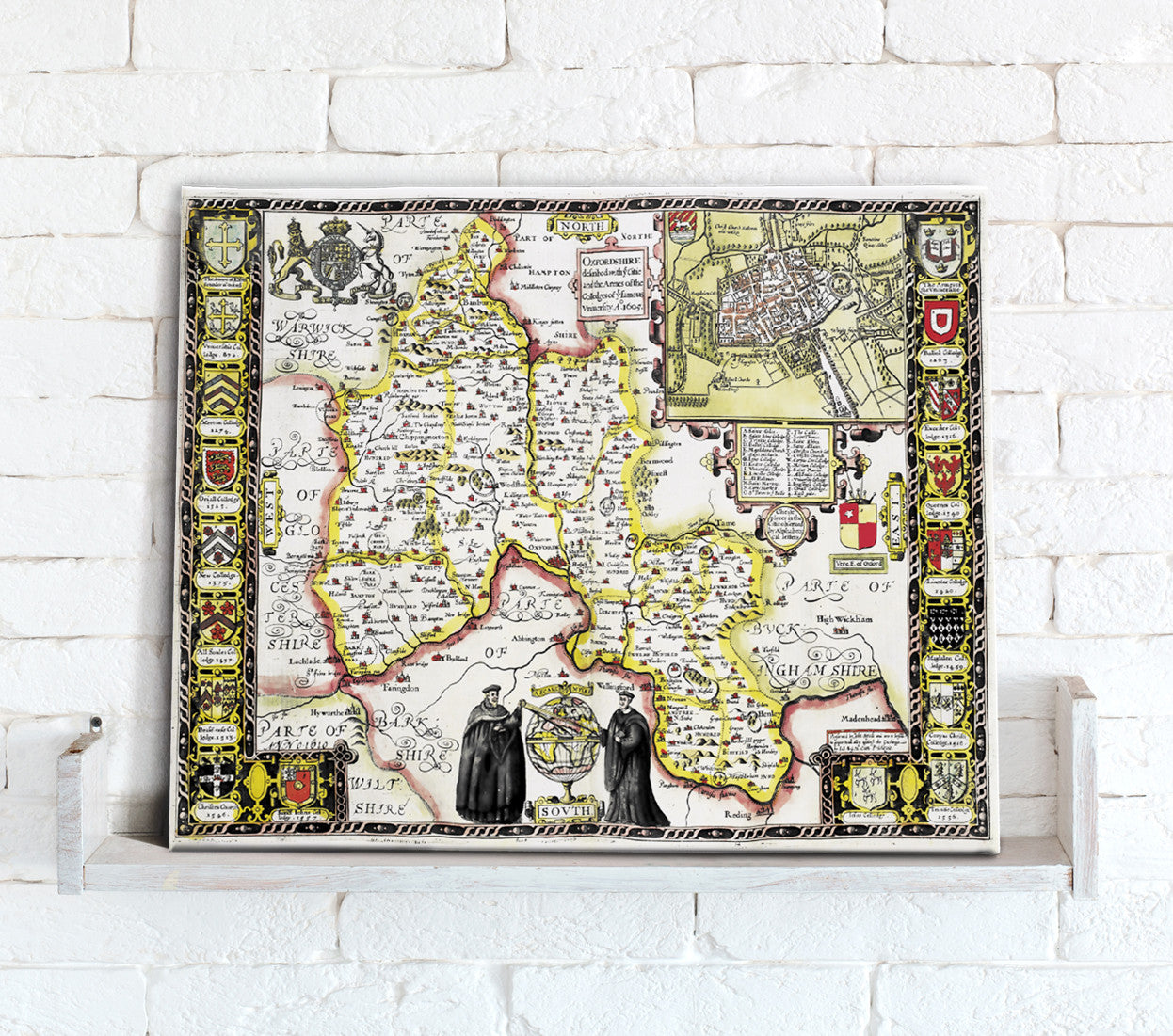 A Beautiful Vintage County map of Oxfordshire. A reproduction of the hand drawn map by the 17th Century cartographer John Speed. Set within a decorative border and flanked by coats of arms with a plan of Oxford.