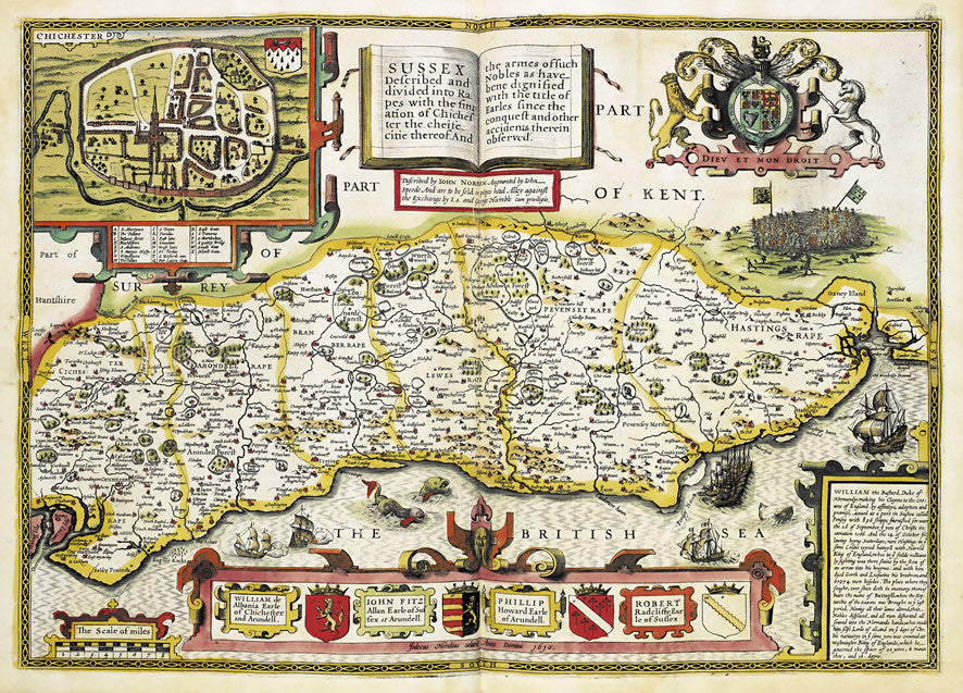 A Beautiful Vintage County map of Sussex. A reproduction of the hand drawn map by the 17th Century cartographer John Speed. Set within a decorative border and surrounded by intricate illustrations including a plan of Chichester with text detailing the Battle of Hastings.