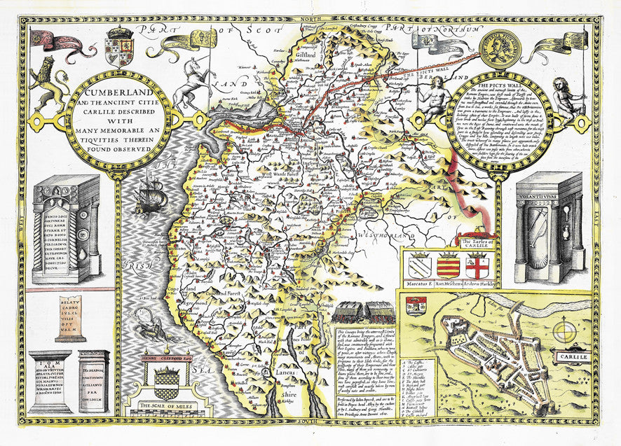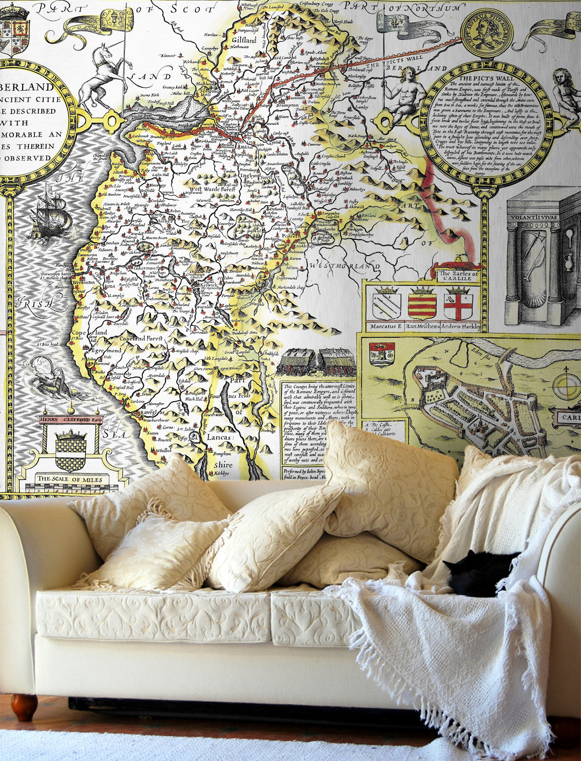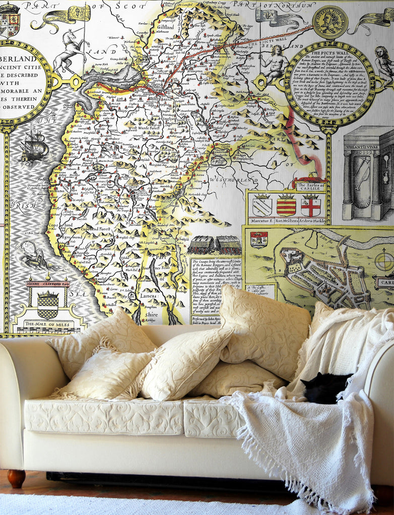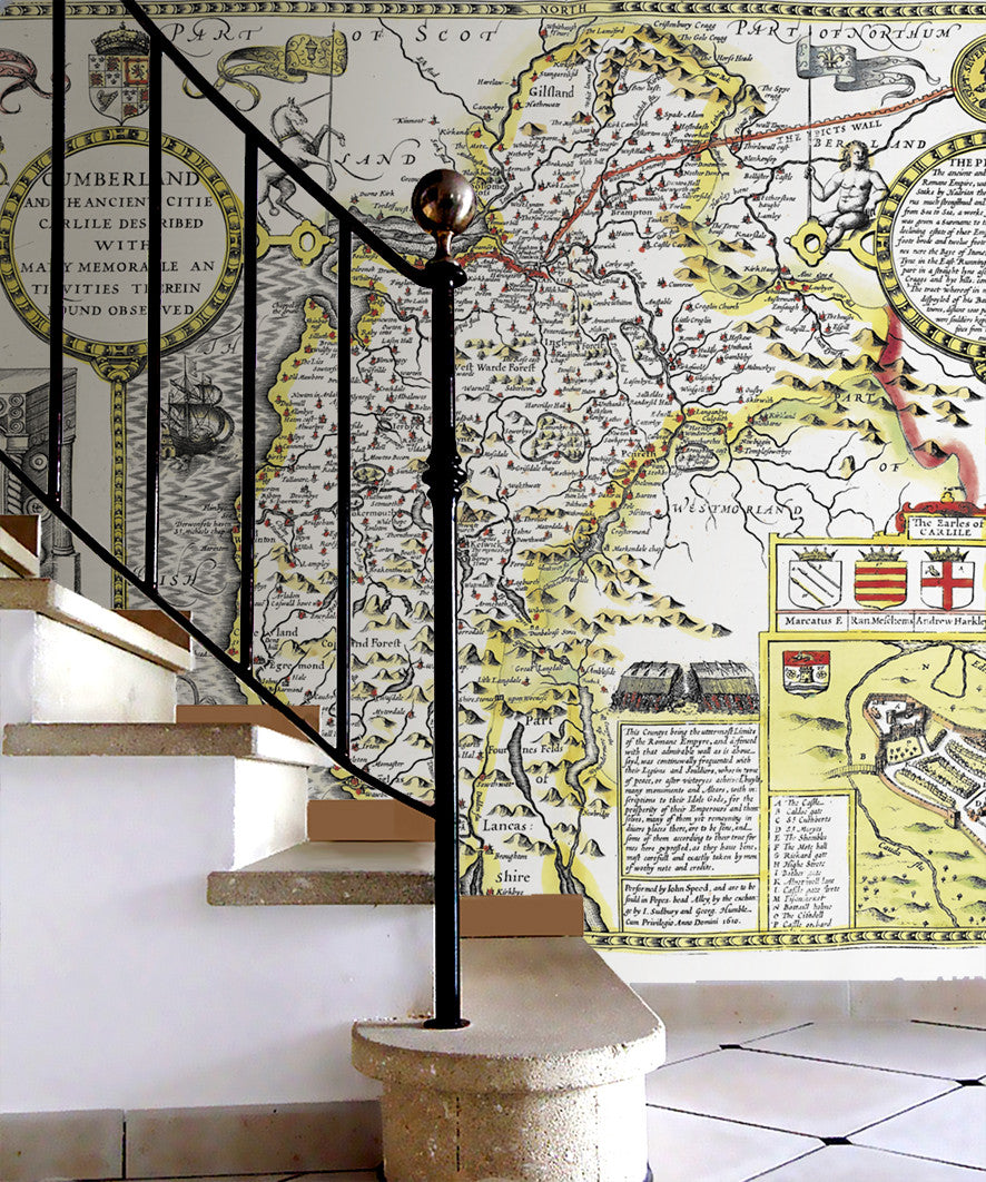A Beautiful Vintage County map of Cumberland. A reproduction of the hand drawn map by the 17th Century cartographer John Speed. Set within a decorative border and surrounded by intricate illustrations including a plan of Carlisle as a small walled city. This highly decorative antique wallpaper will transform any wall into an interior masterpiece.