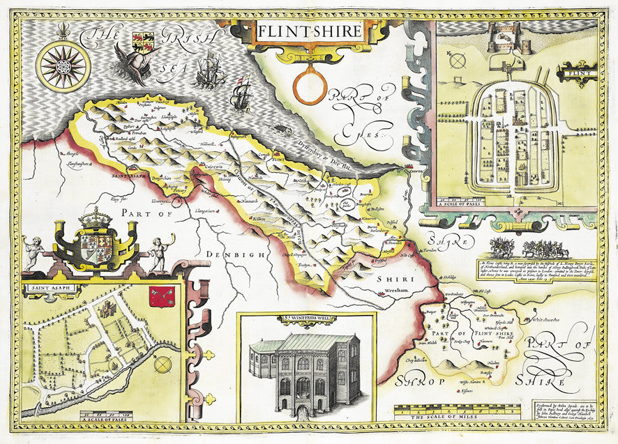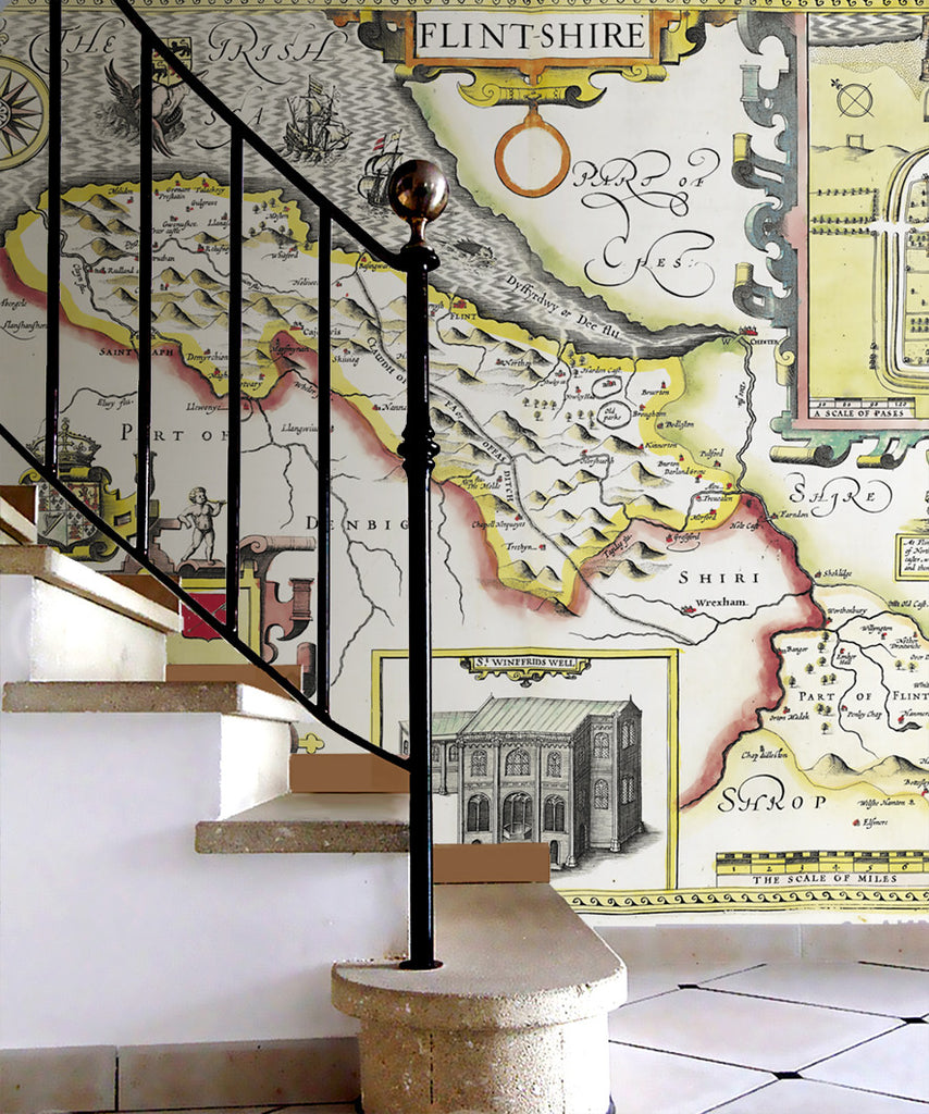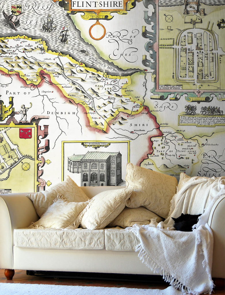 A Beautiful Vintage County map of Flintshire. A reproduction of the hand drawn map by the 17th Century cartographer John Speed. Set within a decorative border and surrounded by intricate illustrations including plans of Flint and Saint Asaph. This highly decorative antique wallpaper will transform any wall into an interior masterpiece.