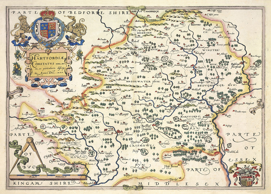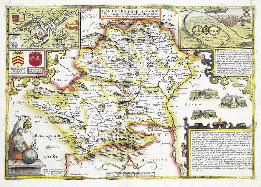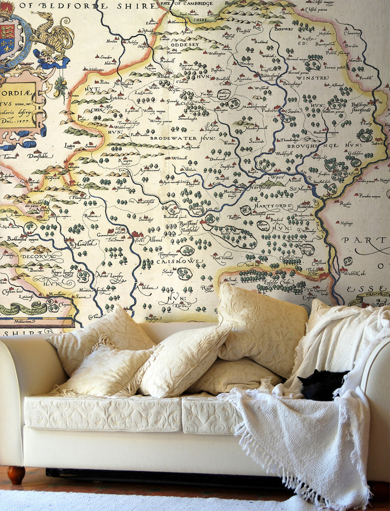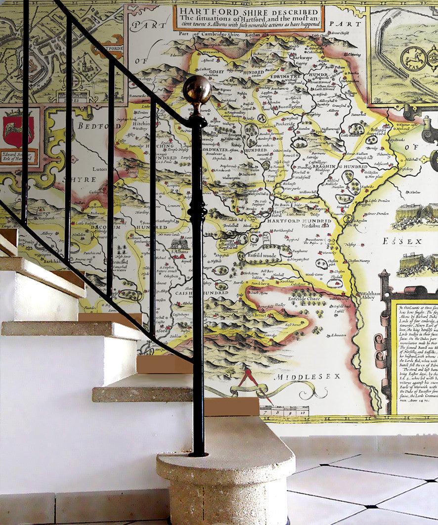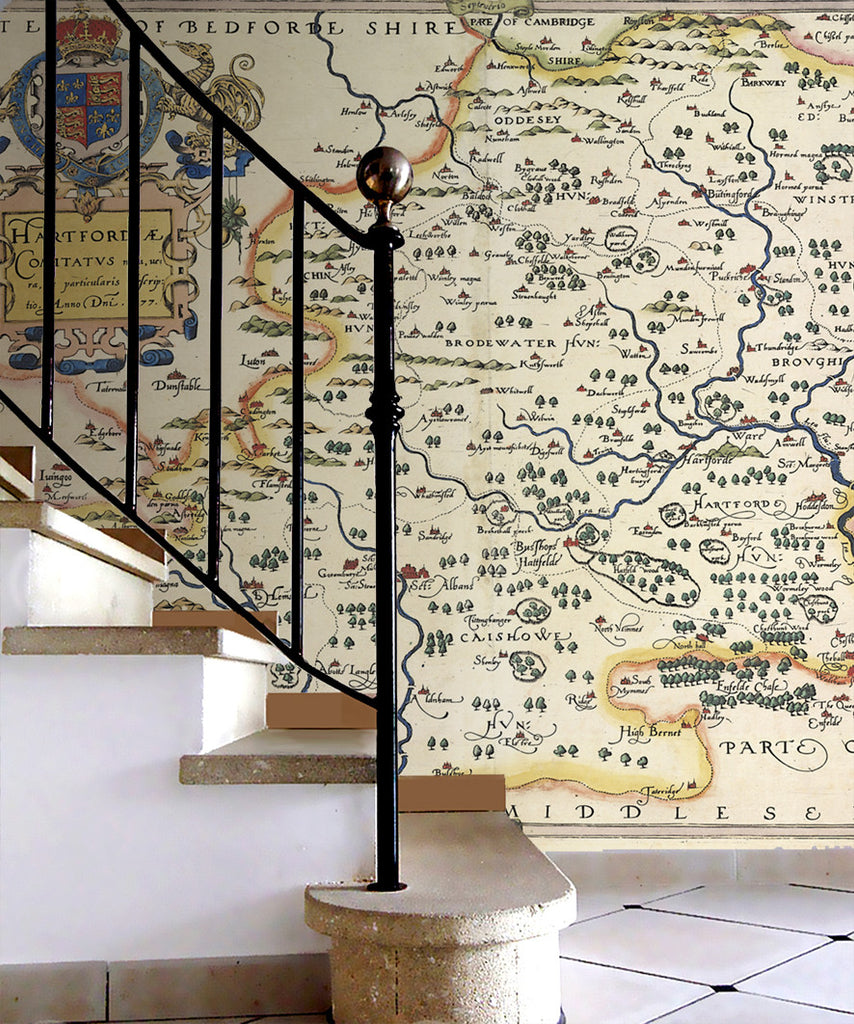 A choice of two beautiful Vintage County maps of Hertfordshire. Reproductions of the hand drawn maps by the cartographers John Speed in the 17th century or the earlier 16th century Christopher Saxton. Set within decorative borders and surrounded by intricate illustrations with the Speed map showing a plan of Hertford. These highly decorative antique wallpapers will transform any wall into an interior masterpiece.