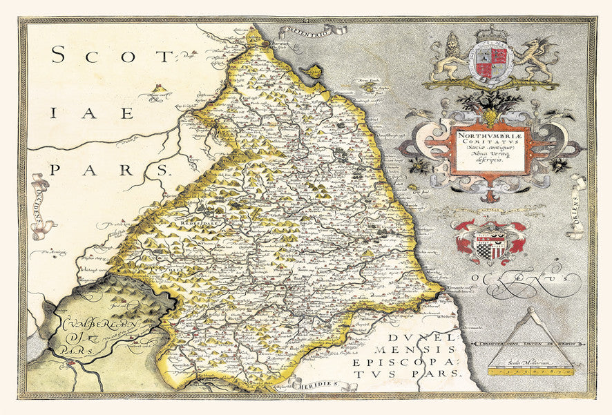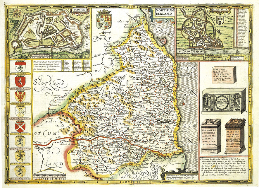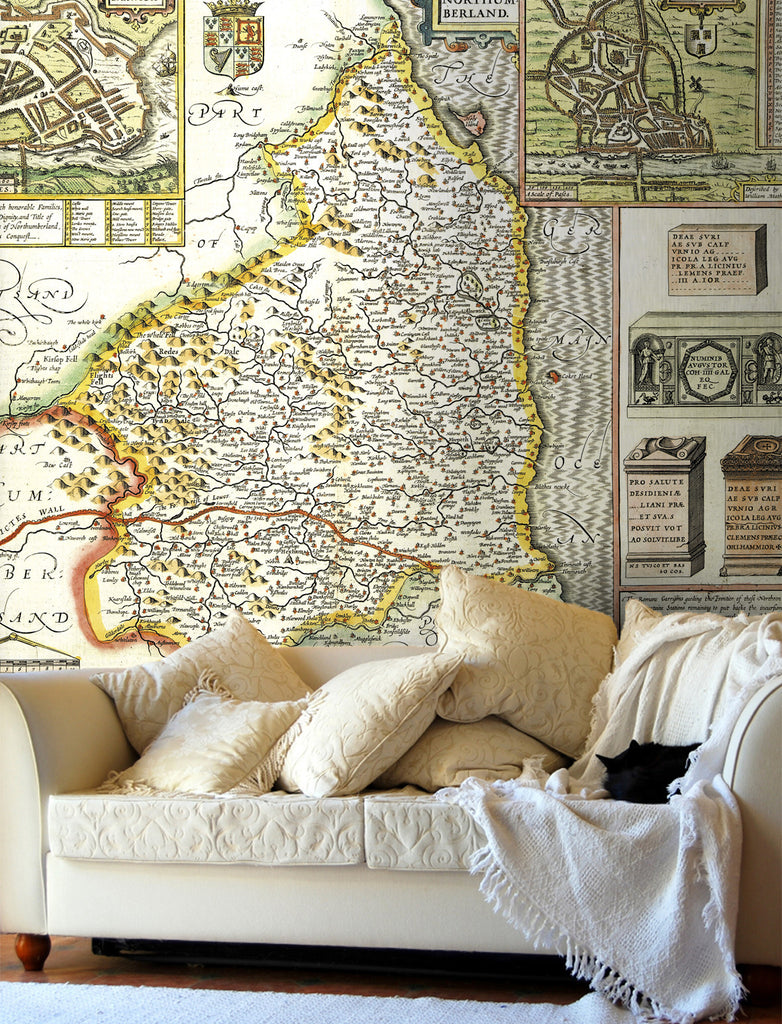 A choice of two beautiful Vintage County maps of Northumberland. Reproductions of the hand drawn maps by the cartographers John Speed in the 17th century or the earlier 16th century Christopher Saxton. Set within decorative borders and surrounded by intricate illustrations with the Speed map showing plans of Newcastle and Barwick. These highly decorative antique wallpapers will transform any wall into an interior masterpiece.