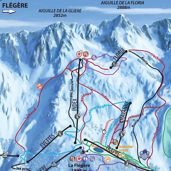 A large poster print of Chamonix ski resort map, one of the oldest ski resorts in France. Situated at the base of Mont Blanc near the borders of Italy and Switzerland. The town of Chamonix and village of Les Praz are included on the map with Le Brevent and La Flegere ski areas.
