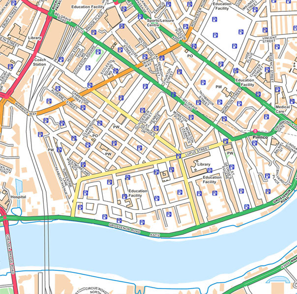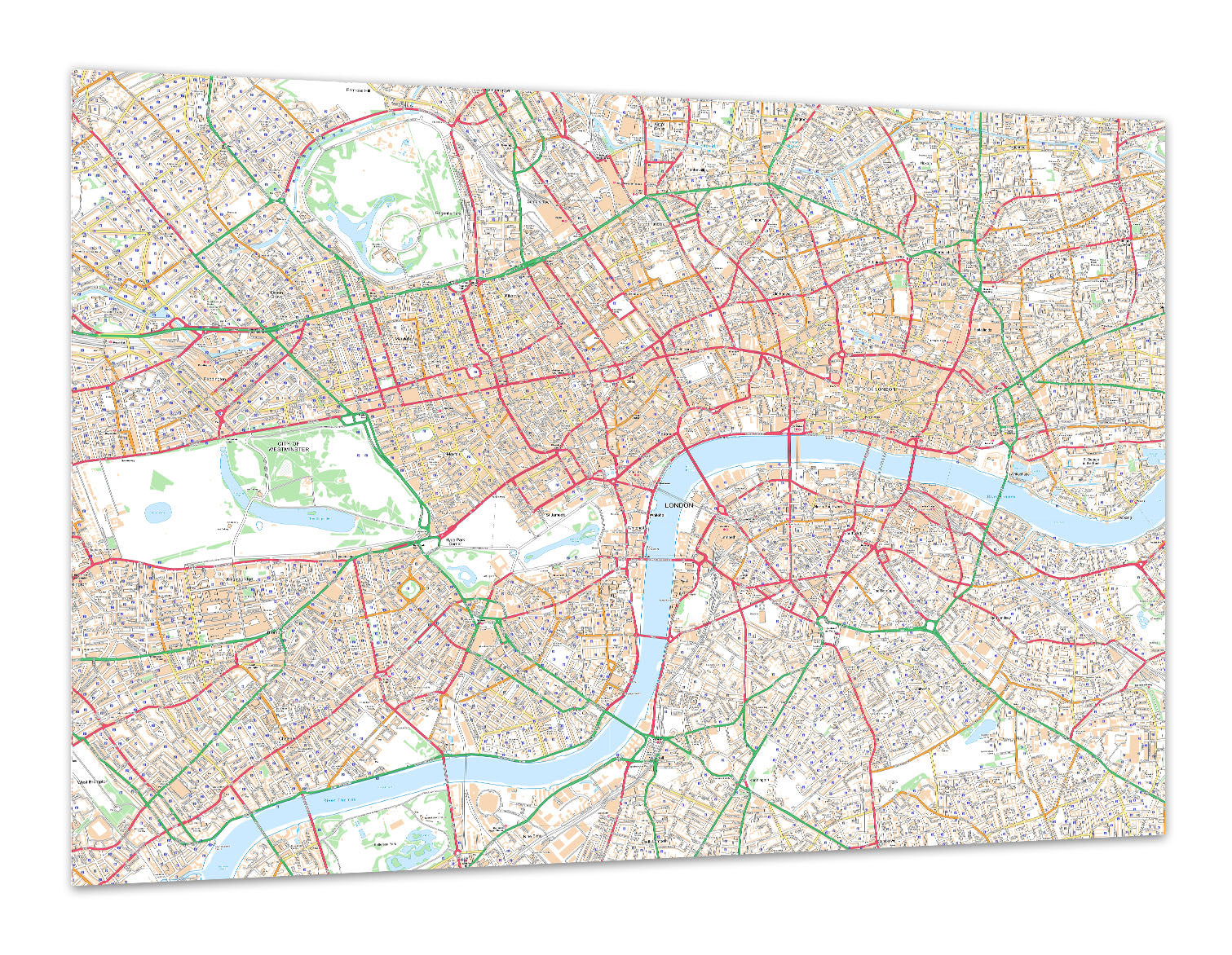 A detailed street map of the centre of London showing road names, buildings, parks and other interesting detail allowing you to explore the intricate depths of our fascinating city in a classic Ordnance Survey Style.