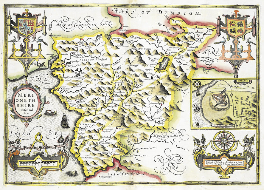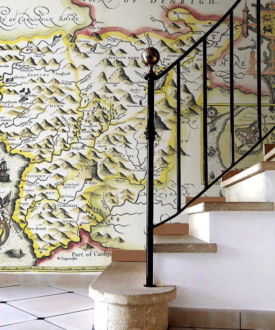 • A Beautiful Vintage County map of Merionethshire. A reproduction of the hand drawn map by the 17th Century cartographer John Speed. Set within a decorative border and surrounded by intricate illustrations including a plan of Harlech. This highly decorative antique wallpaper will transform any wall into an interior masterpiece.