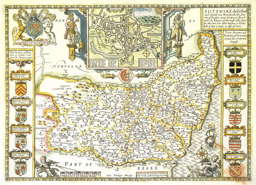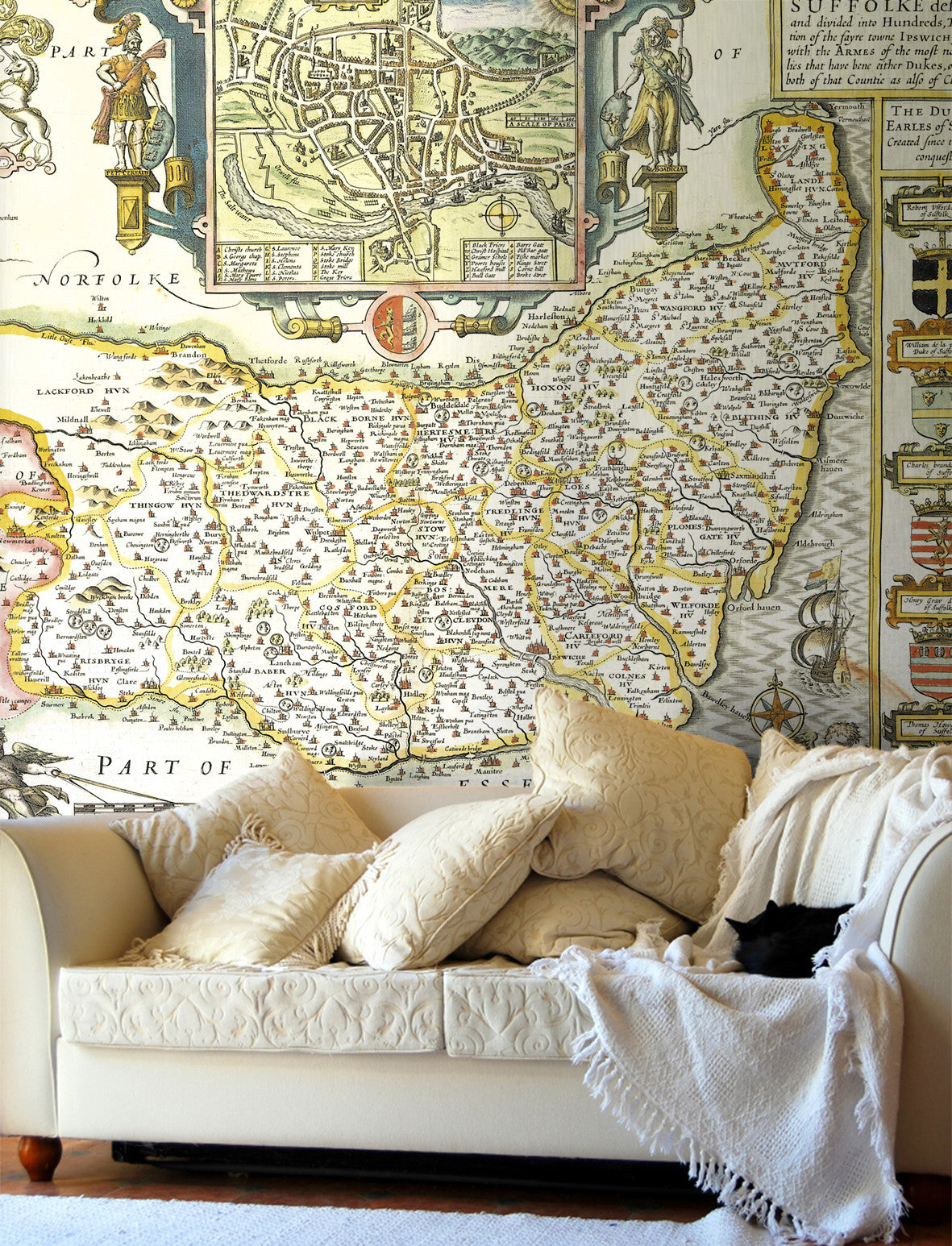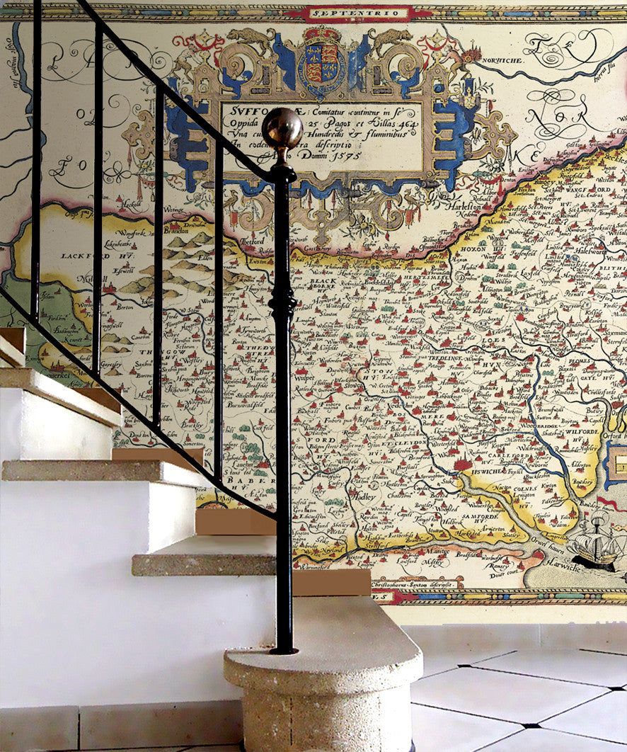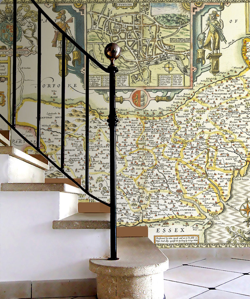 A choice of two beautiful Vintage County maps of Suffolk. Reproductions of the hand drawn maps by the cartographers John Speed in the 17th century or the earlier 16th century Christopher Saxton. Set within decorative borders and surrounded by intricate illustrations with the Speed map showing a plan of Ipswich. These highly decorative antique wallpapers will transform any wall into an interior masterpiece.