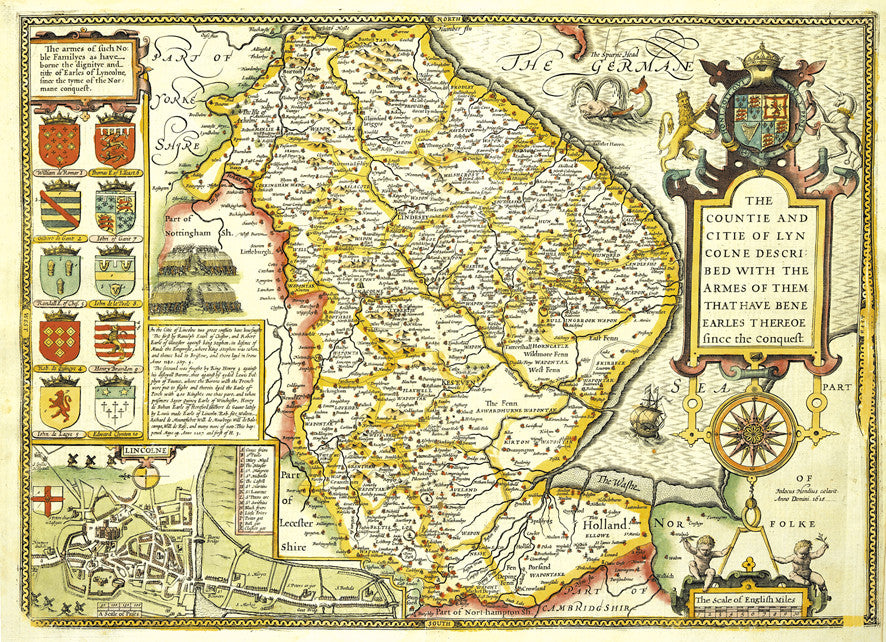 • A Beautiful Vintage County map of Lincolnshire. A reproduction of the hand drawn map by the 17th Century cartographer John Speed. Set within a decorative border and surrounded by intricate illustrations including a plan of Lincoln.