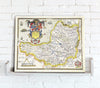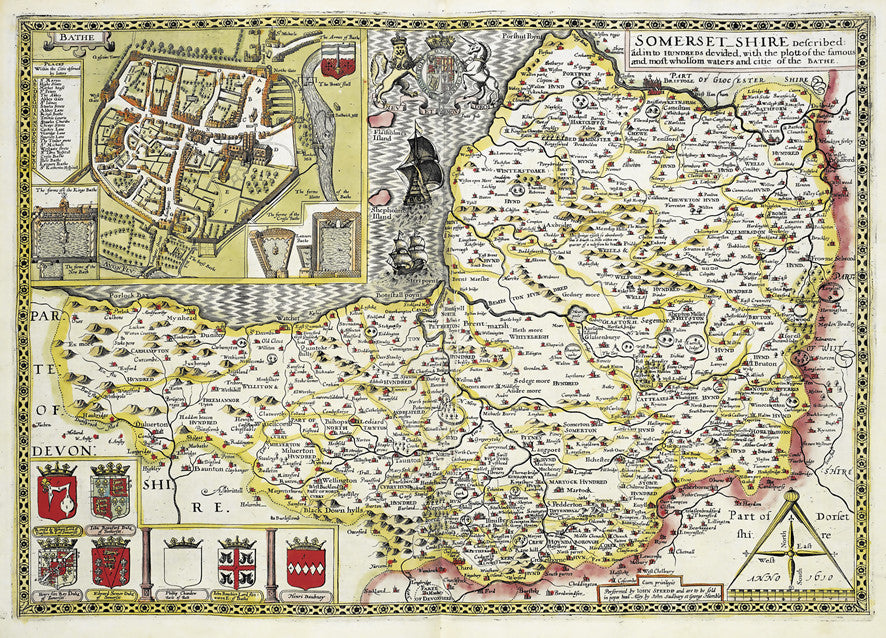 A choice of two beautiful Vintage County maps of Somerset. Reproductions of the hand drawn maps by the cartographers John Speed in the 17th century or the earlier 16th century Christopher Saxton. Set within decorative borders and surrounded by intricate illustrations with the Speed map showing a plan of Bath.