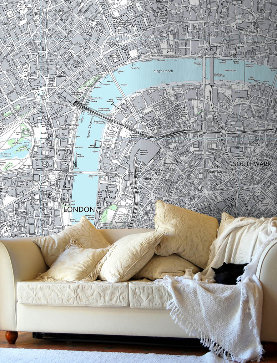 Create a unique feature wall with this Ordnance Survey Street map. Centre the map on a postcode of your choice in England, Scotland or Wales and we'll make a bespoke map wallpaper for your home or office.