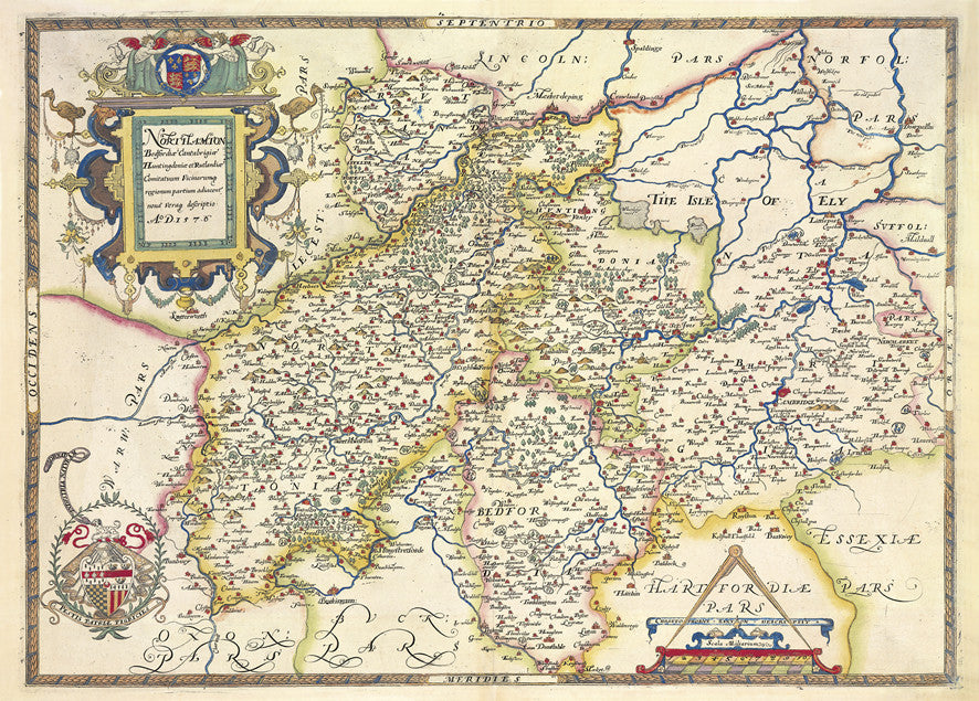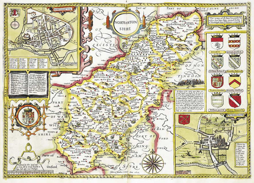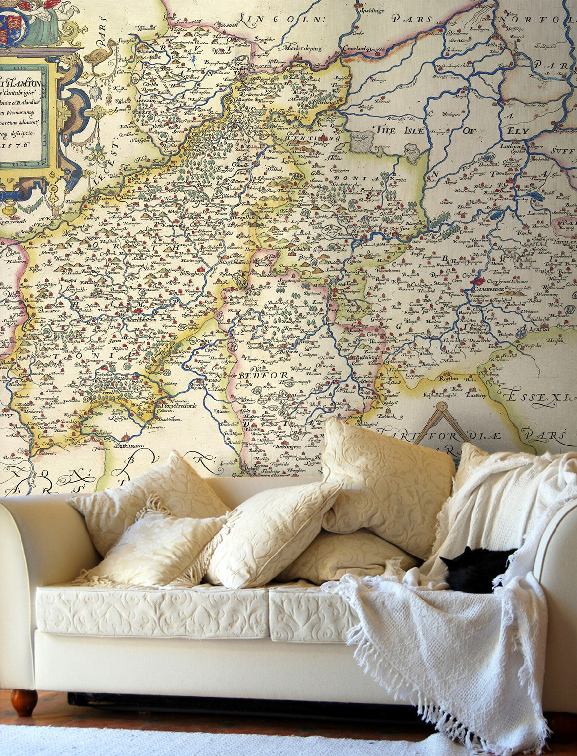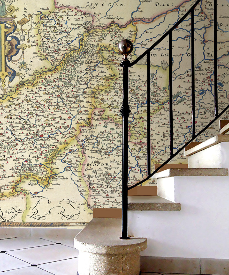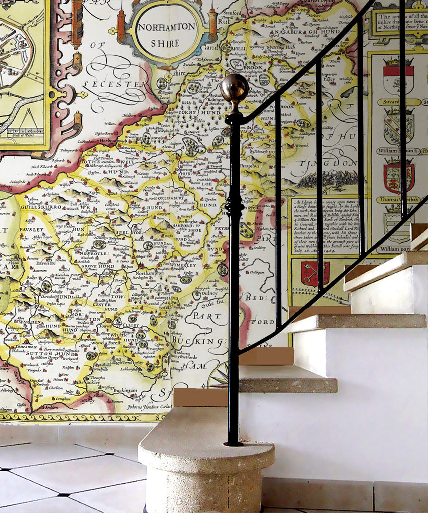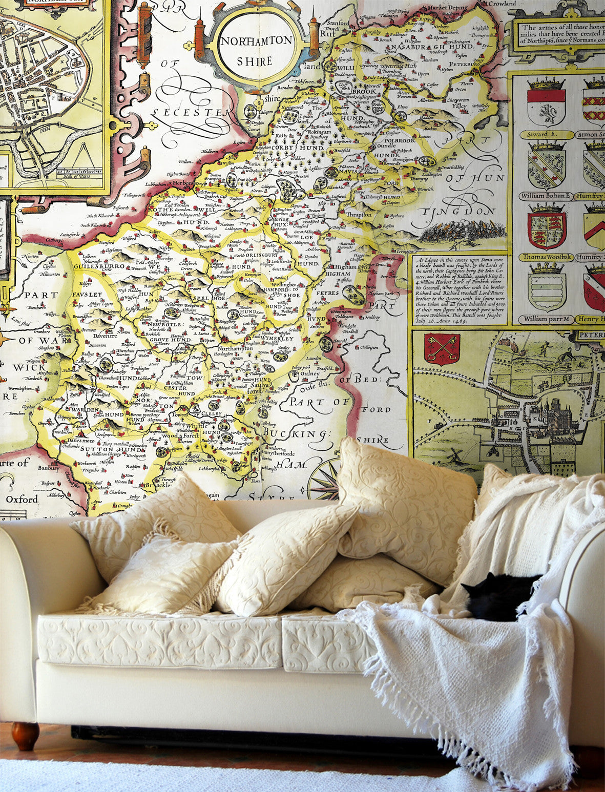 A choice of two beautiful Vintage County maps of Northamptonshire. Reproductions of the hand drawn maps by the cartographers John Speed in the 17th century or the earlier 16th century Christopher Saxton. Set within decorative borders and surrounded by intricate illustrations with the Speed map showing plans of Northampton and Peterborough. These highly decorative antique wallpapers will transform any wall into an interior masterpiece.