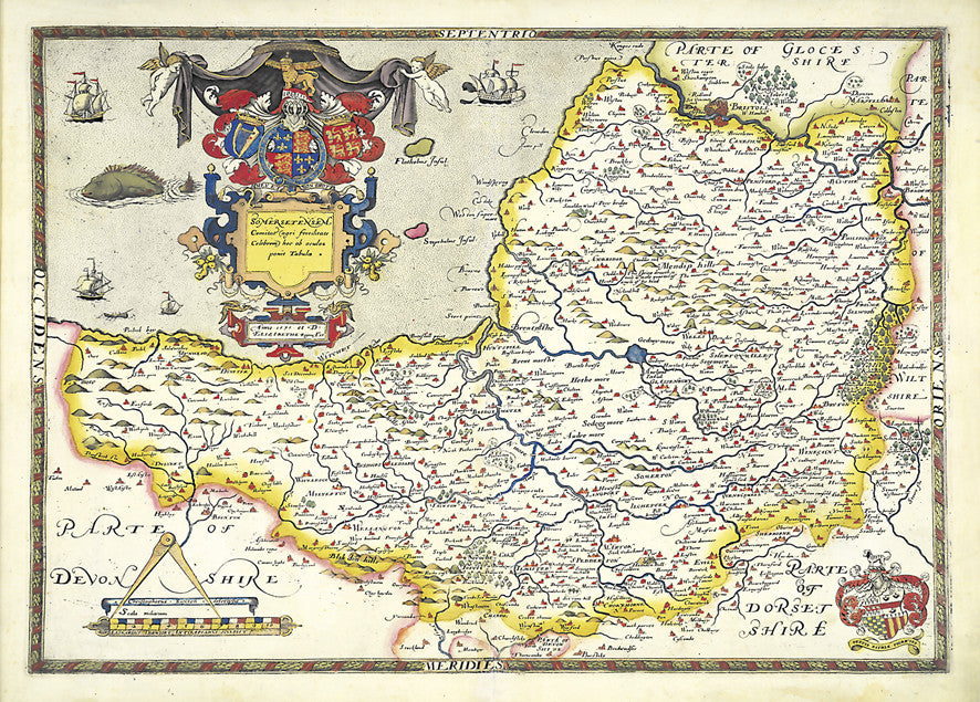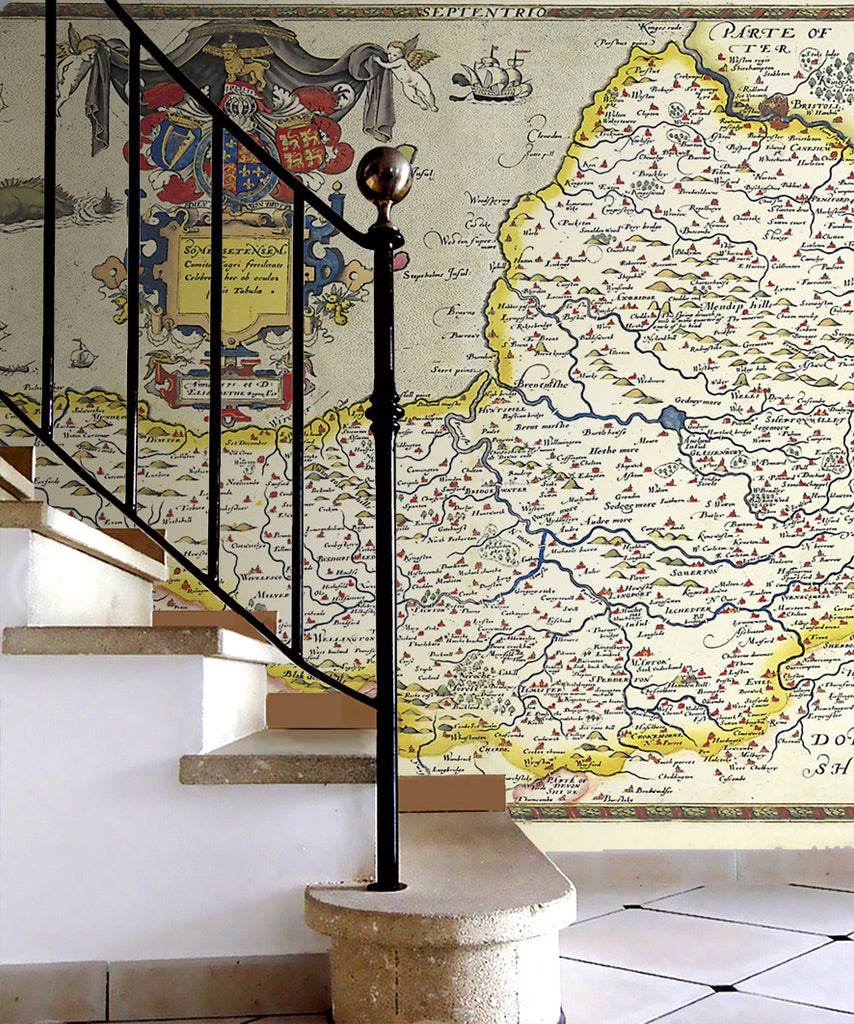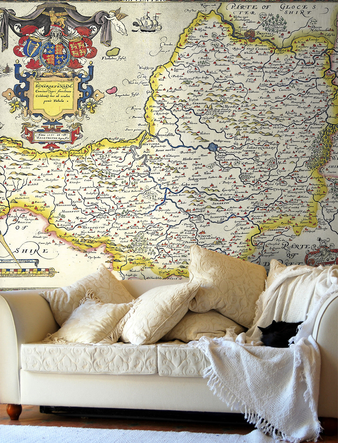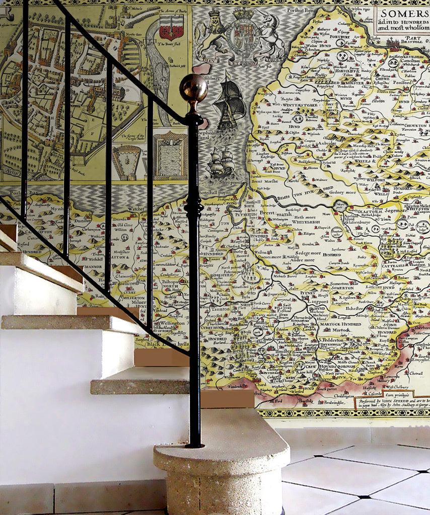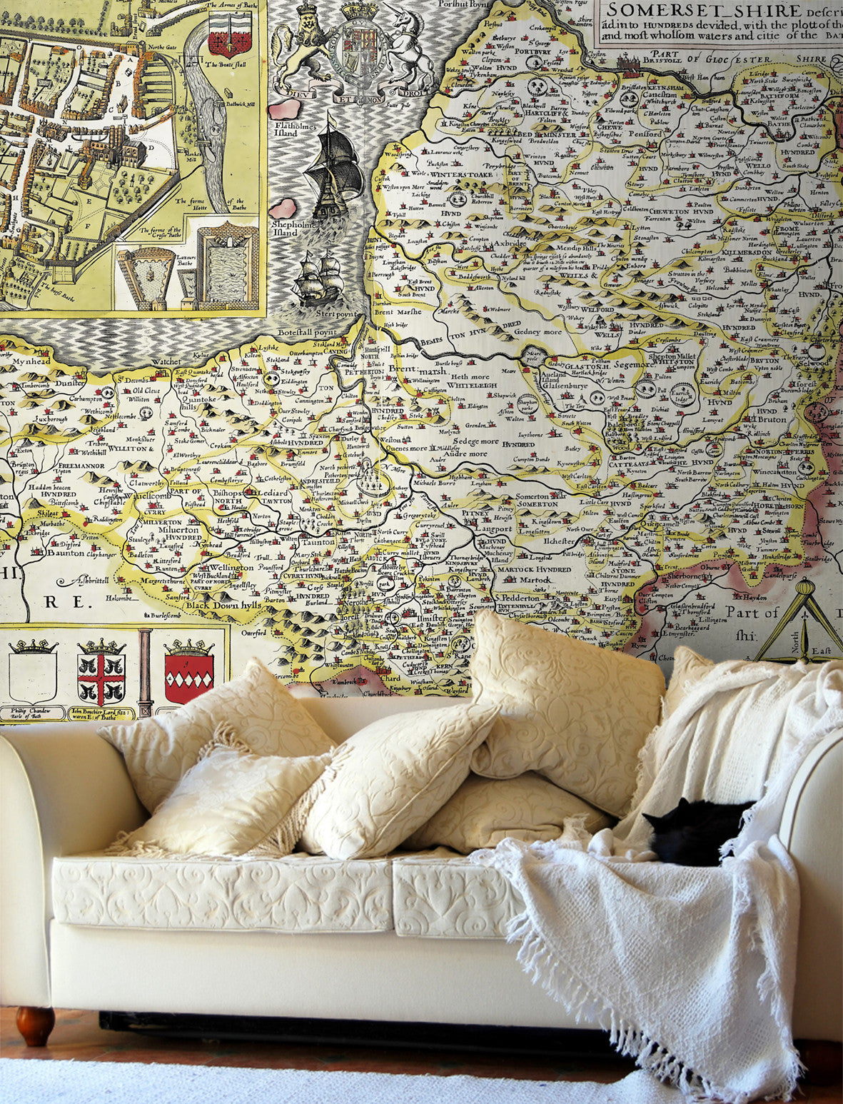 A choice of two beautiful Vintage County maps of Somerset. Reproductions of the hand drawn maps by the cartographers John Speed in the 17th century or the earlier 16th century Christopher Saxton. Set within decorative borders and surrounded by intricate illustrations with the Speed map showing a plan of Bath. These highly decorative antique wallpapers will transform any wall into an interior masterpiece.