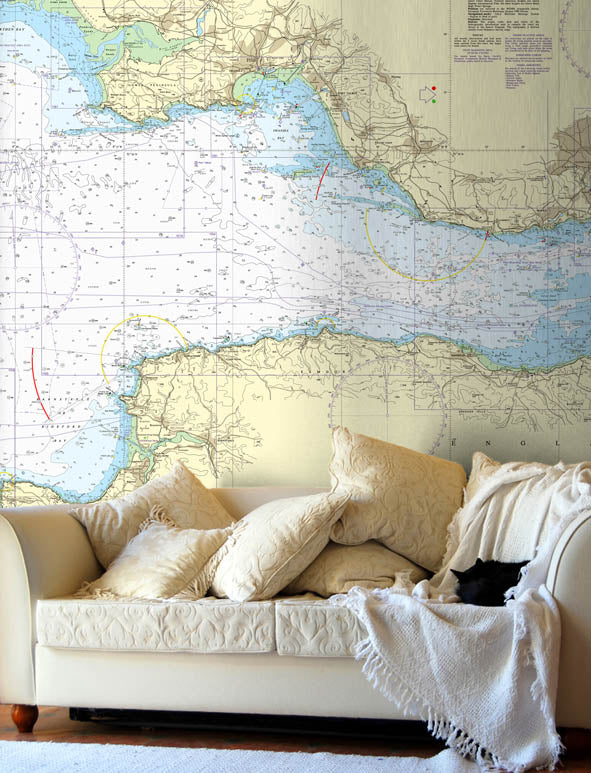 The chart can be resized or cropped to fit your wall size, contact our cartographic design team with your wall measurements and we will send you a quote and free digital proof of your custom Nautical Chart wallpaper.