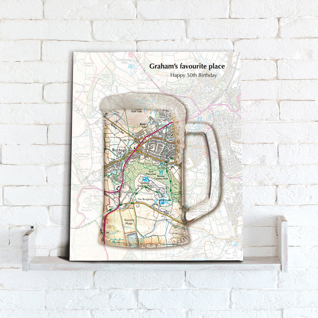 A 1:25,000 Explorer Map or Classic Streetmap (urban areas only) centred on any address and showcased in the shape of a pint glass. (Available for locations in England, Scotland & Wales). Make the gift even more special and add your own personal inscription or message.